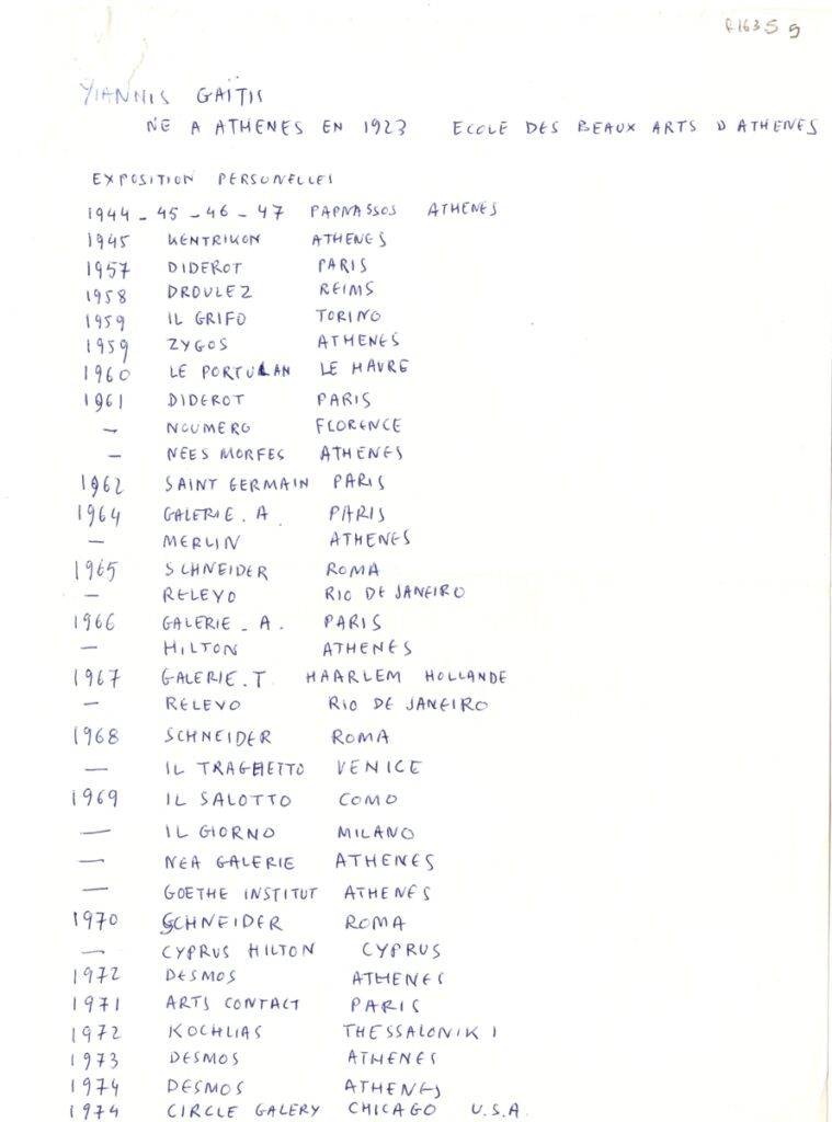 Κείμενο, χειρόγραφο, χαρτί, 2 φφ, 29,5×21 εκ., στα γαλλικά, με λίστα εκθέσεων του Γιάννη Γαΐτη στην Ελλάδα και το εξωτερικό.