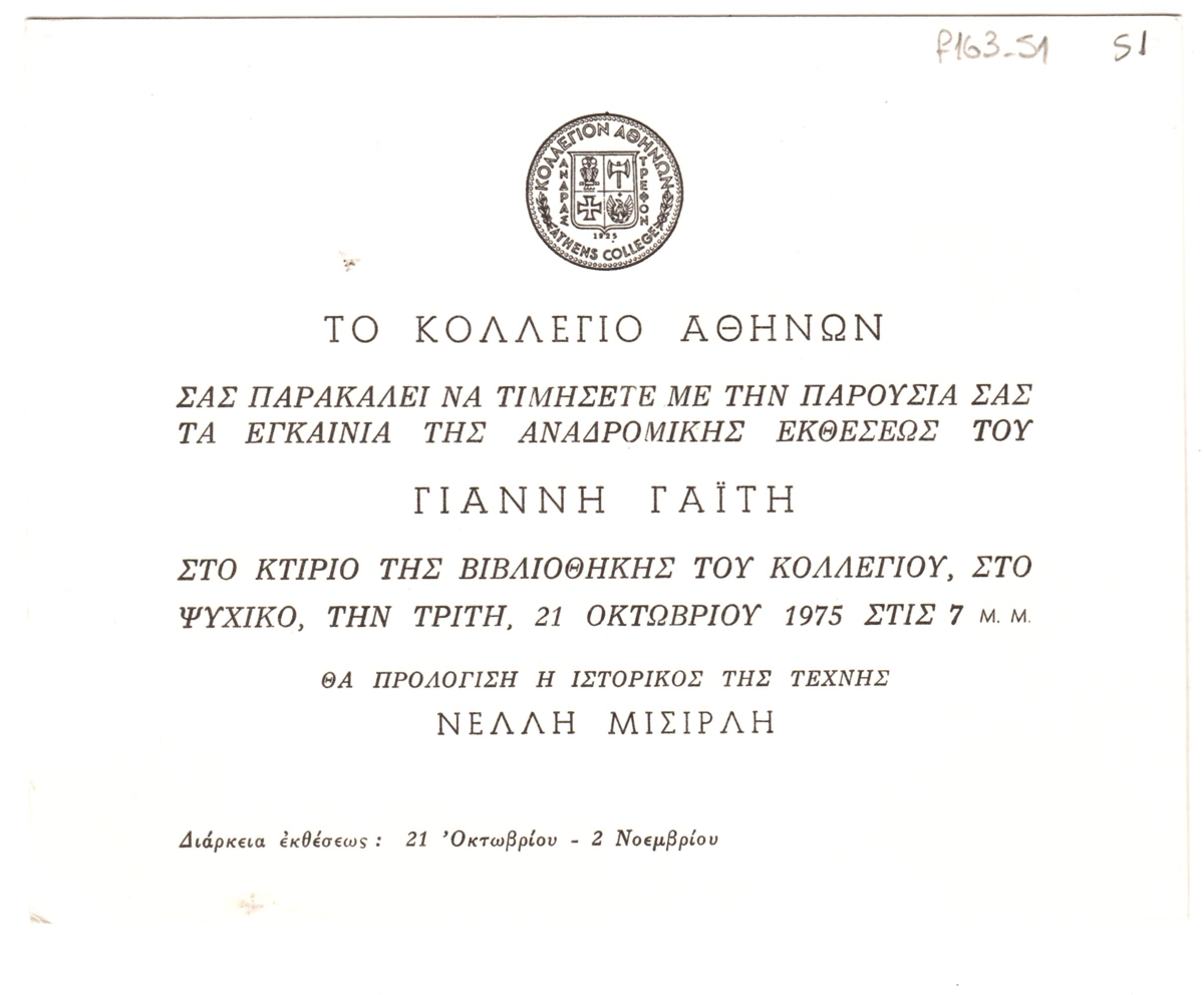 Πρόσκληση, χαρτόνι, 11,5×14,5 εκ., εγκανίων αναδρομικής έκθεσης του Γιάννη Γαΐτη στο Κολλέγιο Αθηνών.