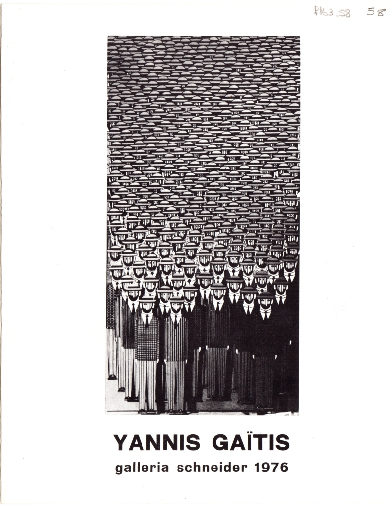 Έντυπο, χαρτόνι αναδιπλωμένο, 21×17 εκ., στα ιταλικά, ατομικής έκθεσης του Γιάννη Γαΐτη. Περιέχει κείμενο για τον καλλιτέχνη και το έργο του, βιογραφικό του με λίστα εκθέσεών του και κατάλογο έργων της έκθεσης. Επιγραφές.