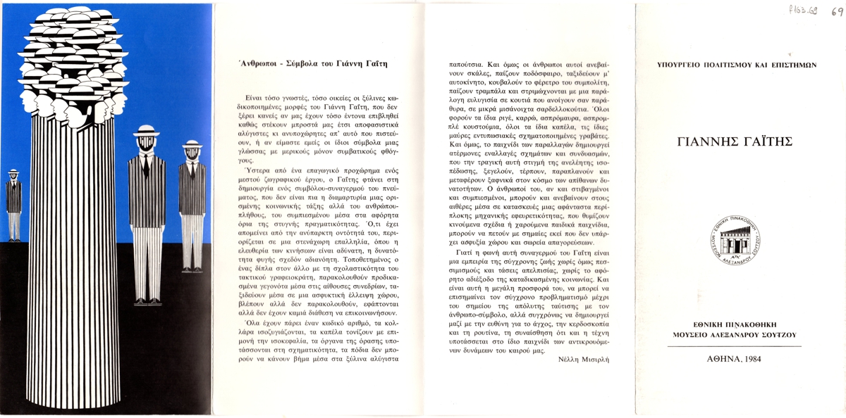 Έντυπο, χαρτί τετράπτυχο, 21×10,5 εκ., στα ελληνικά, αναδρομικής έκθεσης του Γιάννη Γαΐτη. Στο έντυπο υπάρχει κείμενο της Νέλλυς Μισυρλή για τον καλλιτέχνη με τίτλο “‘Ανθρωποι-σύμβολα του Γιάννη Γαΐτη”, κατάλογος έργων σε χρονολογική σειρά και εικονογράφηση.