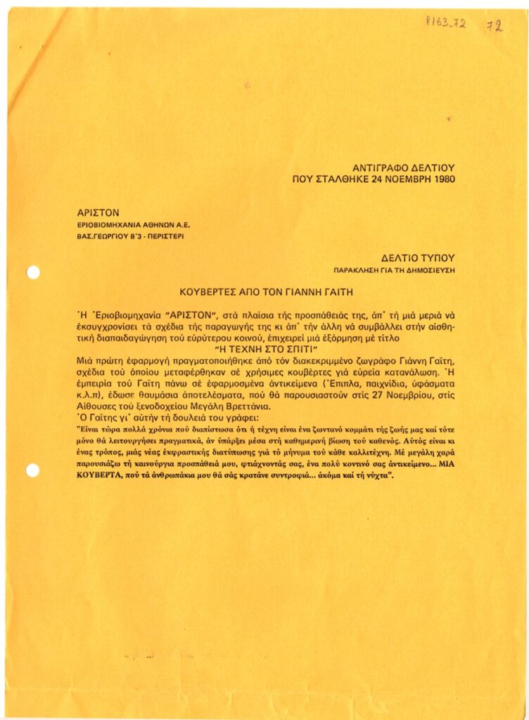 Αντίγραφο δελτίου Τύπου, χαρτί, 29,5×21 εκ., στα ελληνικά, αναφερόμενο στη σύμπραξη του Γιάννη Γαΐτη και της Εριοβιομηχανίας “Άριστον”. Αναπαραγωγές σχεδίων του καλλιτέχνη τυπώθηκαν πάνω σε κουβέρτες ευρείας κατανάλωσης, στο πλαίσιο αισθητικής διαπαιδαγώγησης του κοινού με τίτλο “Η τέχνη στο σπίτι”. Τα αποτελέσματα της σύμπραξης επρόκειτο να παρουσιαστούν στο ξενοδοχείο “Μεγάλη Βρετανία”, στις 27/11/1980.