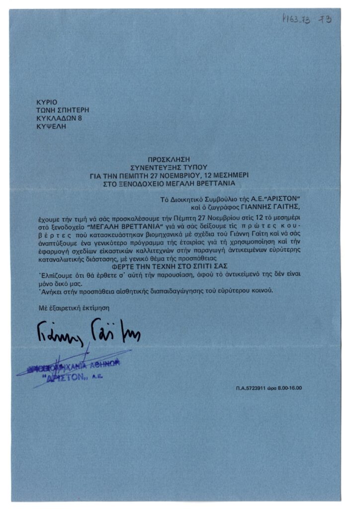 Πρόσκληση, χαρτί, 28×18,5 εκ., στα ελληνικά, σε συνέντευξη Τύπου του Γιάννη Γαΐτη και εκπροσώπων της διοίκησης της Βιομηχανίας ‘Άριστον’.