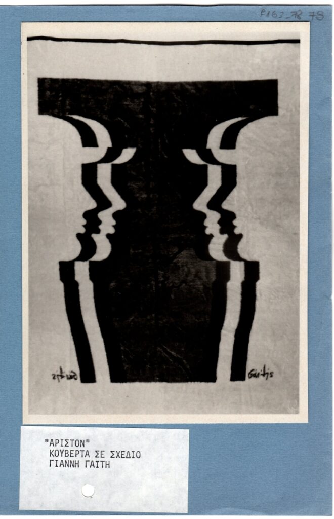 Φωτογραφία, α/μ, φωτογραφικό χαρτί, 16,5×12 εκ., κουβέρτας με σχέδιο του Γιάννη Γαΐτη, κατασκευασμένη από τη Βιομηχανία Άριστον.