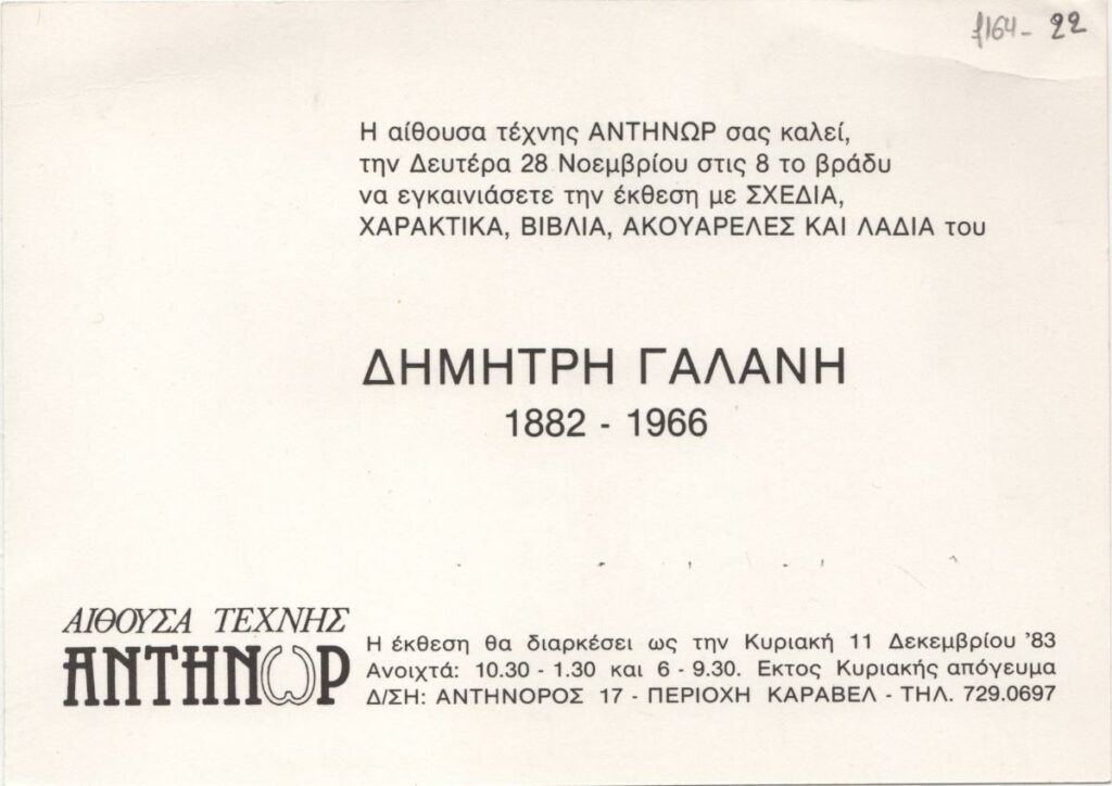 Πρόσκληση εγκαινίων έκθεσης έργων του Δημήτρη Γαλάνη με σχέδια, χαρακτικά, βιβλία, ακουαρέλες και λάδια, που πραγματοποιήθηκε στην Αθήνα.