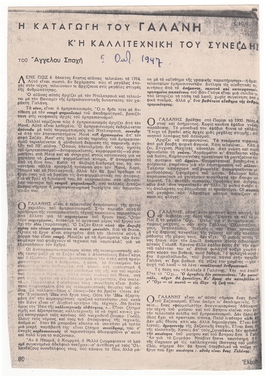 Φωτοαντίγραφο αποκόμματος εντύπου, χαρτί, 27,0×18,8 εκ., όπου δημοσιεύεται, στα ελληνικά, άρθρο του Α. Σπαχή για το έργο του χαράκτη Δημήτρη Γαλάνη με έμφαση στη σχέση του με το κίνημα του ιμπρεσιονισμού. Επάνω επιγραφή.