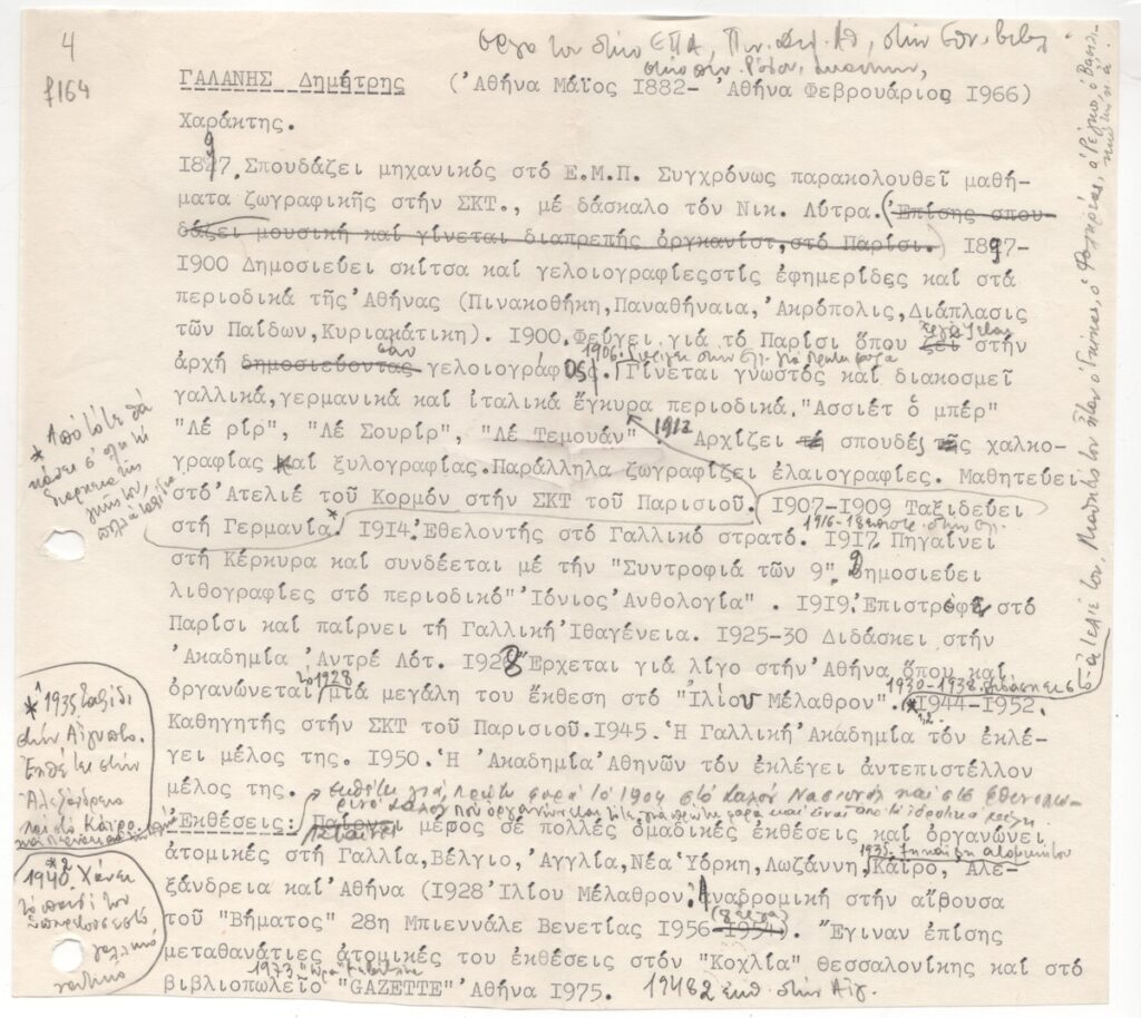 Κείμενο, δακτυλόγραφο με χειρόγραφες διορθώσεις και συμπληρώσεις, στα ελληνικά, σε απόκομμα χαρτιού, μία όψη, 19,5×21,3 εκ.. Σύντομο βιογραφικό σημείωμα του χαράκτη Δημήτρη Γαλάνη. Αναφέρονται σπουδές, επαγγελματική εμπειρία και εκθέσεις.