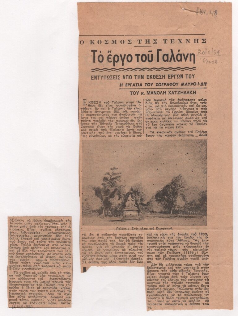 Απόκομμα της εφημερίδας “Ελευθερία” (20/11/1954), όπου δημοσιεύεται, στα ελληνικά, κριτική έκθεσης έργων του Δημήτρη Γαλάνη, που πραγματοποιήθηκε στην Αθήνα.