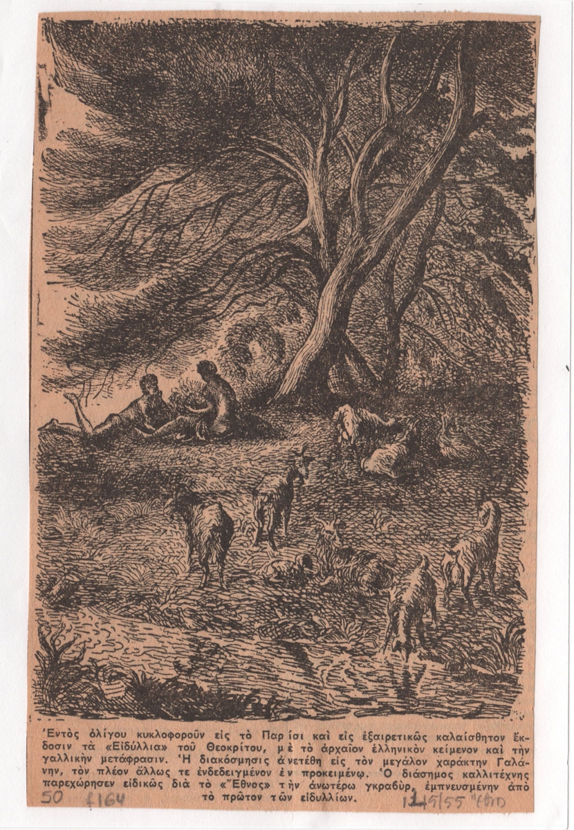 Απόκομμα, έντυπο, χαρτί, 15,0×9,7 εκ., όπου δημοσιεύεται αναπαραγωγή χαρακτικού του Δ. Γαλάνη από τη σειρά που φιλοτέχνησε ο καλλιτέχνης για τα “Ειδύλλια” του Θεόκριτου. Κάτω δεξιά επιγραφή.