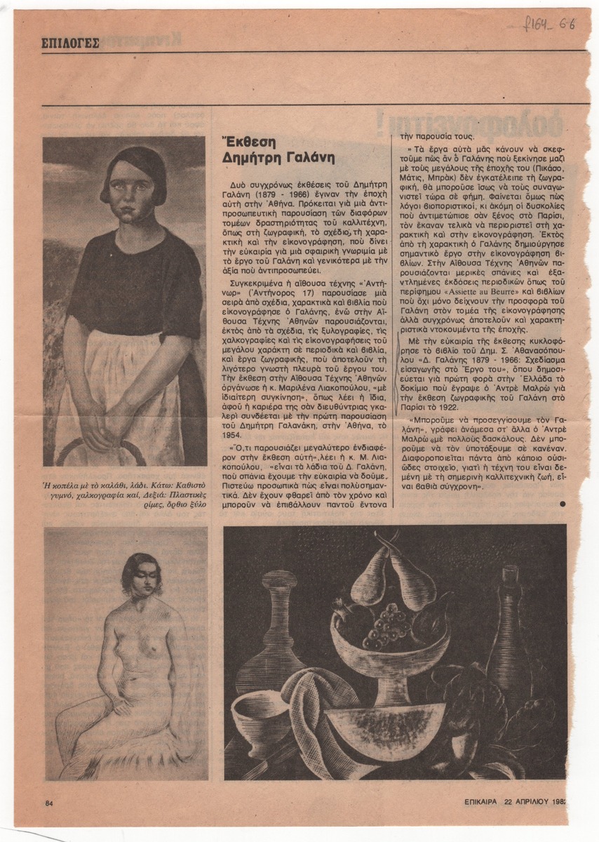 Απόκομμα του περιοδικού “Επίκαιρα” (22/04/1982), όπου δημοσιεύεται άρθρο για τις δύο παράλληλες εκθέσεις έργων του χαράκτη Δημήτρη Γαλάνη, που πραγματοποιήθηκαν στην Αθήνα.