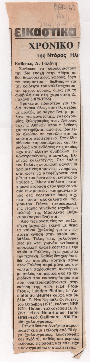 Απόκομμα του περιοδικού “Αντί” (30/04/1982), όπου δημοσιεύεται, στα ελληνικά, άρθρο της Ντόρας Ηλιοπούλου-Ρογκάν για τις δύο παράλληλες εκθέσεις έργων του χαράκτη Δημήτρη Γαλάνη στην Αθήνα.