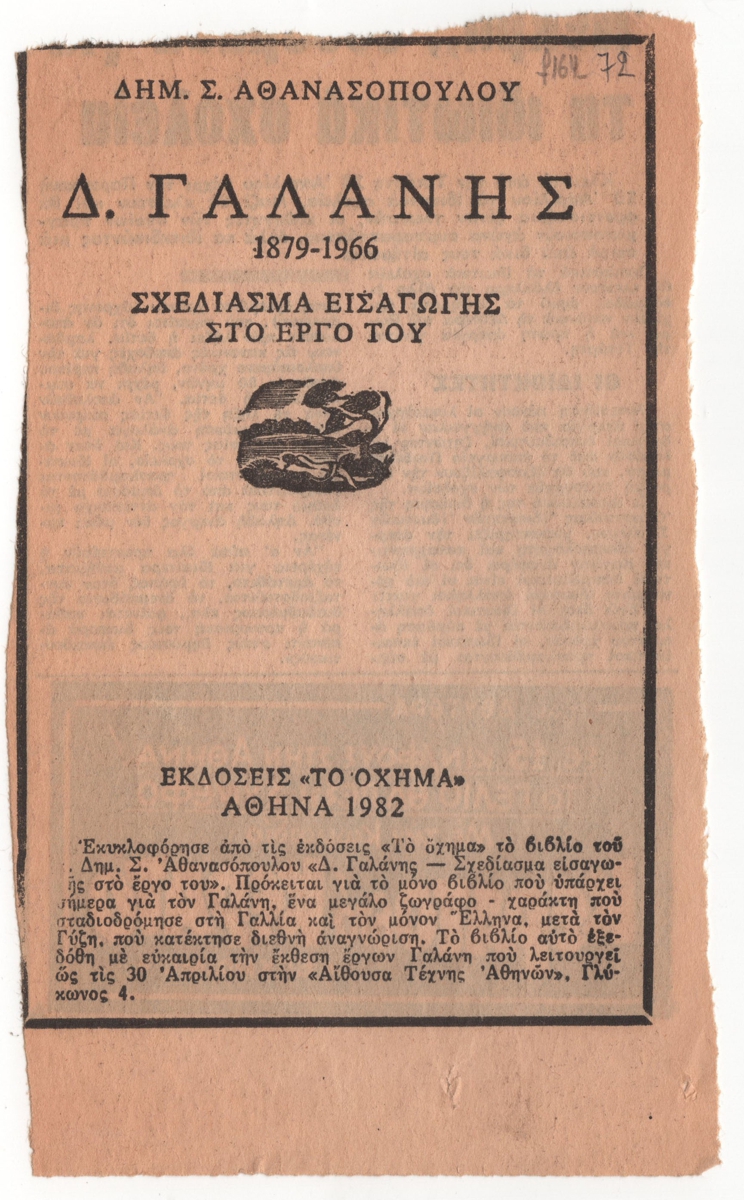 Απόκομμα, έντυπο, χαρτί, 17,0×10,3 εκ., όπου δημοσιεύεται, στα ελληνικά, διαφήμιση της μονογραφίας του Δημ. Αθανασόπουλου “Δ. Γαλάνης – Σχεδίασμα εισαγωγής στο έργο του”, που κυκλοφόρησε παράλληλα με έκθεση έργων του καλλιτέχνη στην Αθήνα το 1982.