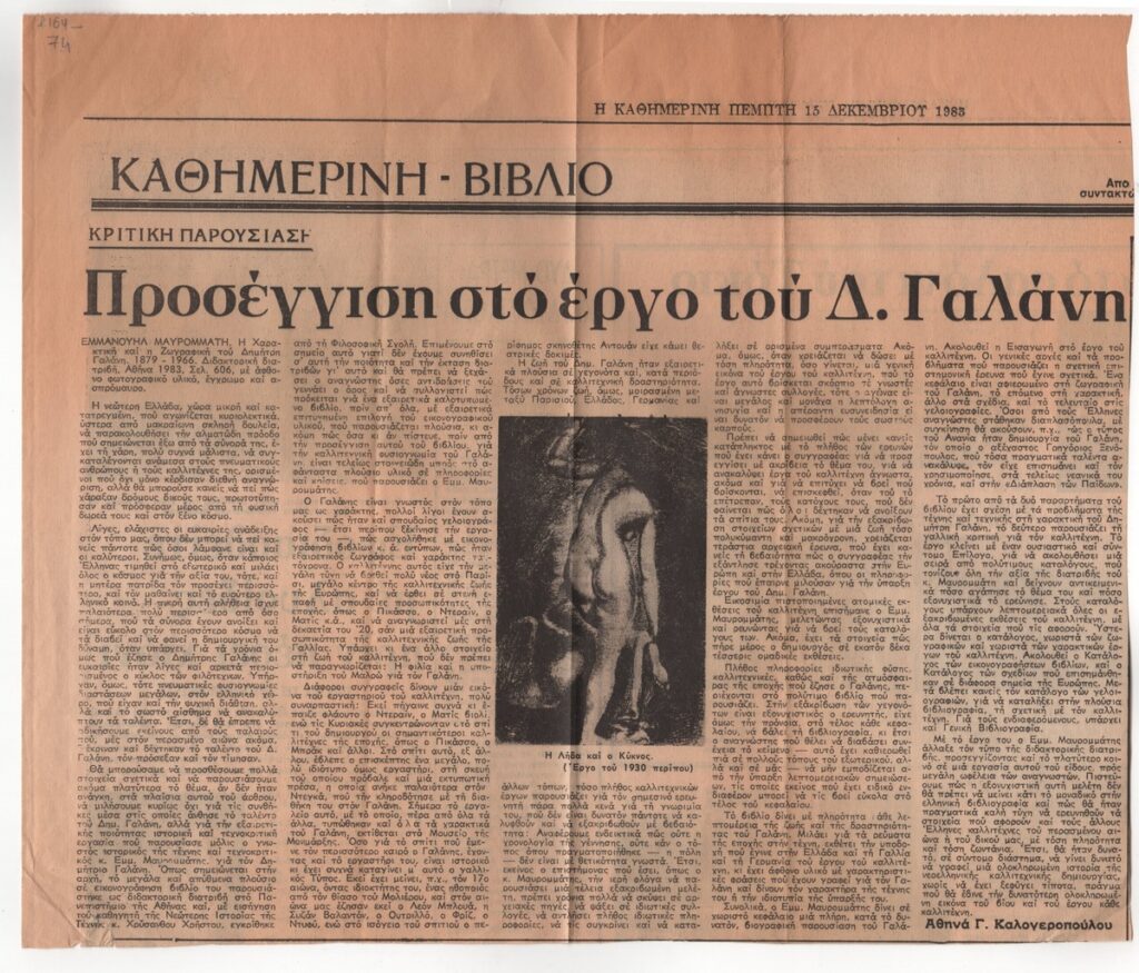 Απόκομμα της εφημερίδας “Η Καθημερινή” (15/12/1985), όπου δημοσιεύεται κριτική παρουσίαση της διδακτορικής διατριβής του Εμμανουήλ Μαυρομάτη για τον καλλιτέχνη με τίτλο : “Η χαρακτική και η ζωγραφική του Δημήτρη Γαλάνη”.