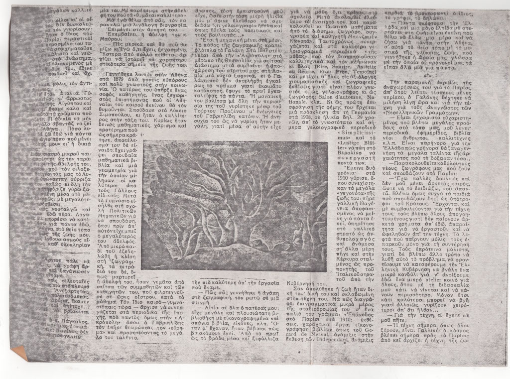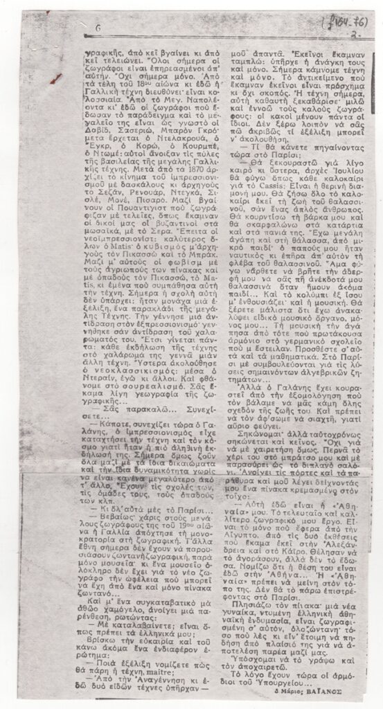 Φωτοαντίγραφο αποκομμάτων εντύπου, χαρτί, τρία τμήματα, 19,8×29,3 και 26,6×13,5 εκ., όπου δημοσιεύεται, στα ελληνικά, συνέντευξη του Δημήτρη Γαλάνη στον Μάριο Βαϊανό. Το άρθρο περιλαμβάνει επίσης εκτενή αναφορά στη ζωή και το έργο του. Εικονογραφείται αναπαραγωγή φωτογραφίας του καλλιτέχνη με ιδιόχειρη αφιέρωση στον συγγραφέα του άρθρου και αναπαραγωγή έργου.