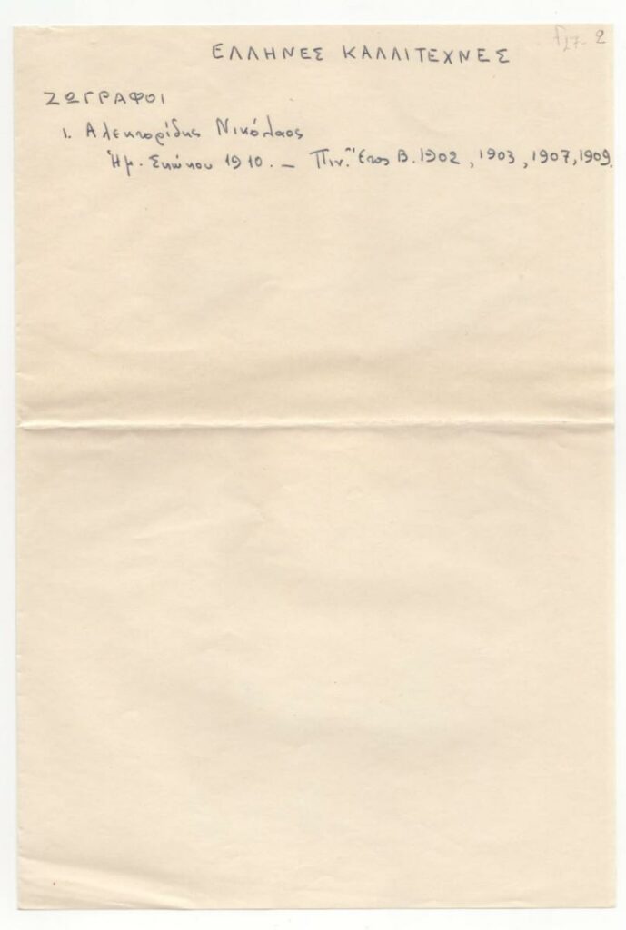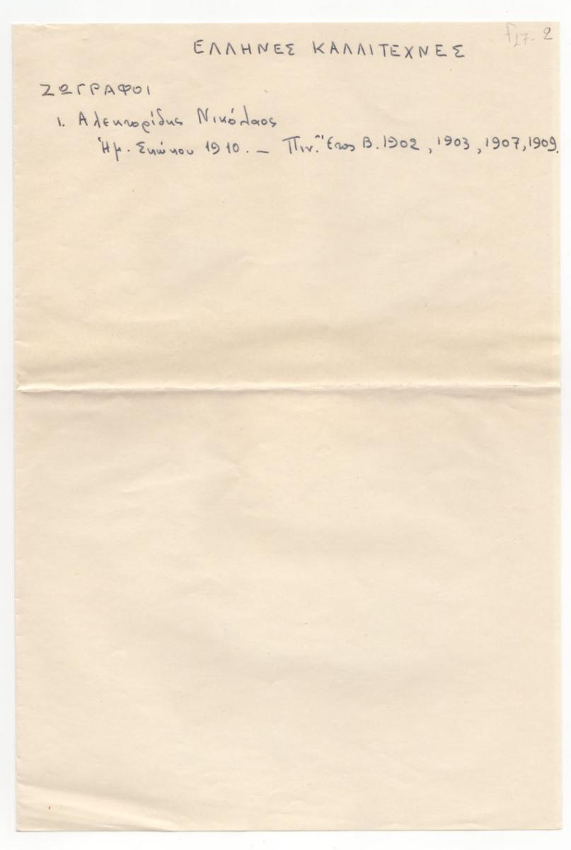 Κείμενο, χειρόγραφο, με μπλε μελάνι, στα ελληνικά, σε δίφυλλο χαρτιού, μίας όψης, 28,8×19,5 εκ. Παραπομπή σε δημοσίευση για τον ζωγράφο Νικόλαο Αλεκτορίδη στο περιοδικό ΗΜΕΡΟΛΟΓΙΟΝ ΣΚΟΚΟΥ.