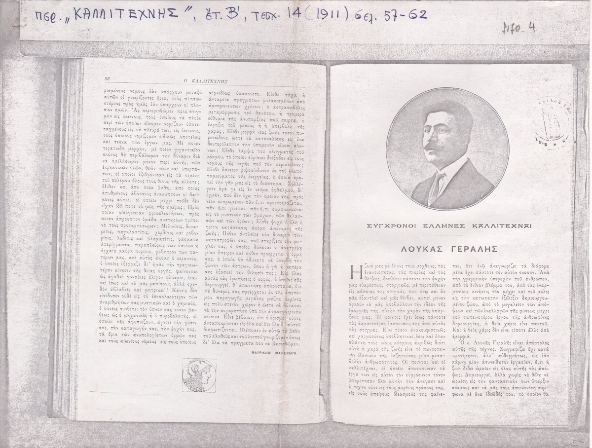 Φωτοαντίγραφο αποκόμματος εντύπου, χαρτί, 21,0×27,5 εκ., στα ελληνικά. Κείμενο για τον καλλιτέχνη του Γερ. Βώκος στο περιοδικό “Καλλιτέχνης”. Εικονογραφείται με αναπαραγωγή φωτογραφίας και αναπαραγωγές έργων του καλλιτέχνη.
