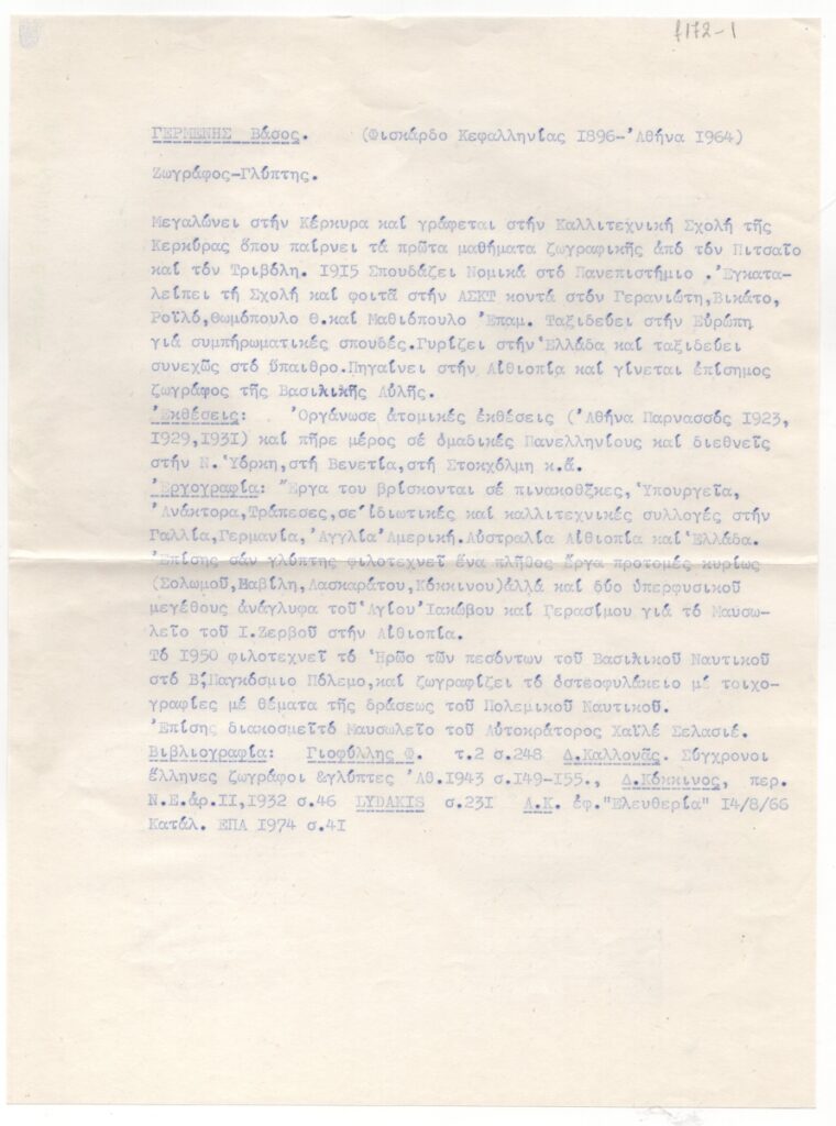 Κείμενο, δακτυλόγραφο, χαρτί, 28,7×21,0 εκ., στα ελληνικά. Περιέχει σύντομα βιογραφικά στοιχεία, σπουδές, εκθέσεις, εργογραφία, βιβλιογραφία.