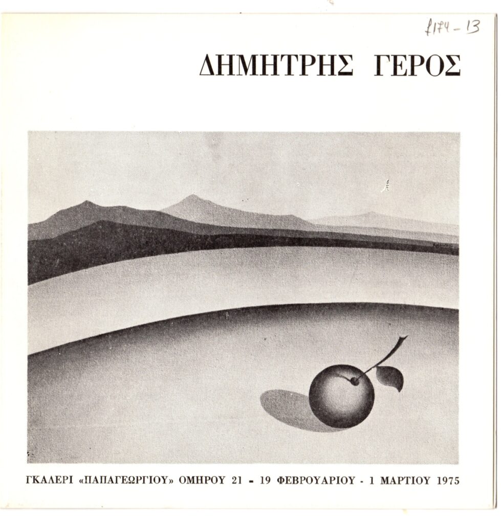 Έντυπο, χαρτόνι αναδιπλωμένο, 16,5×16,5 εκ., έκθεσης του Δημήτρη Γέρου. Περιέχει εικονογράφηση, βιογραφικό του καλλιτέχνη και κείμενα των Στέλιου Λυδάκη και Χρύσανθου Χρήστου για τον καλλιτέχνη.