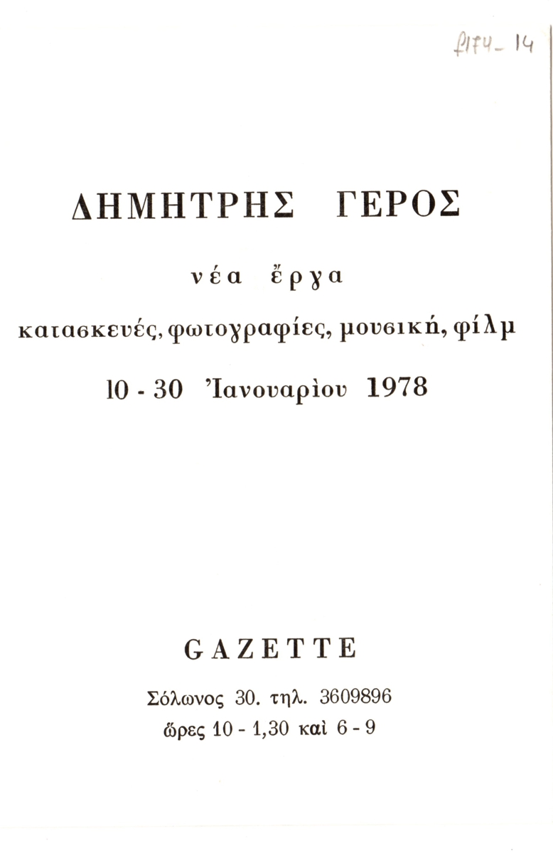 Έντυπο, χαρτόνι, 17,3×12,6 εκ., στα ελληνικά, ατομικής έκθεσης του Δημήτρη Γέρου.