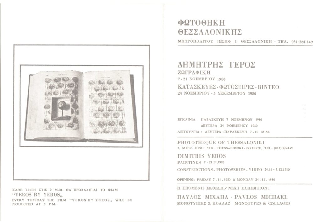 Έντυπο, χαρτόνι αναδιπλωμένο, 16×12 εκ., στα ελληνικά και αγγλικά, με αναγγελία των δύο παράλληλων ατομικών εκθέσεων του Δημήτρη Γέρου στη Φωτοθήκη Θεσσαλονίκης, με τίτλους: “Δημήτρης Γέρος- Ζωγραφική” και “Κατασκευές- Φωτοσειρές-Βίντεο”.