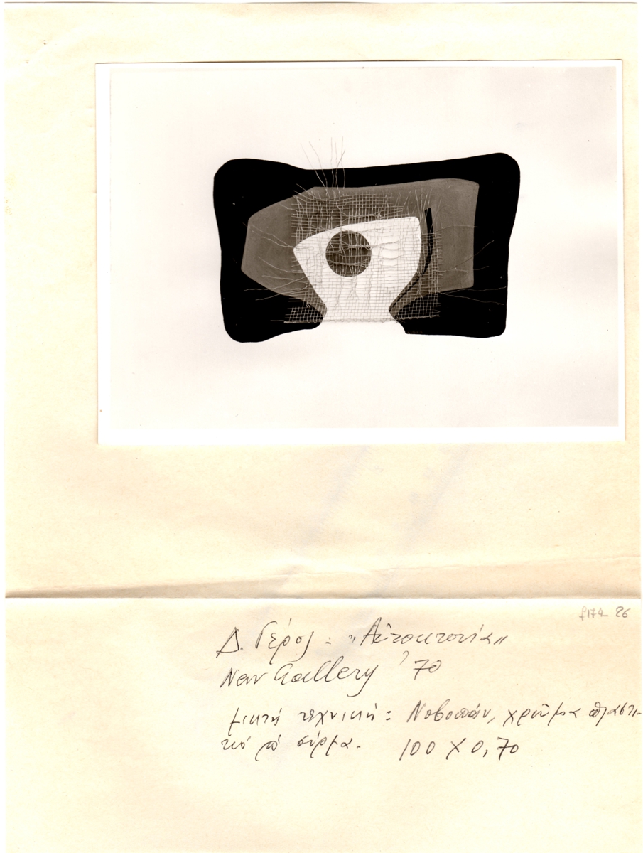 Φωτογραφία, α/μ, φωτογραφικό χαρτί, 13×17,5 εκ., κολλημένη σε λευκή κόλλα διαστάσεων 29×21,5 εκ., έργου του Δημήτρη Γέρου.