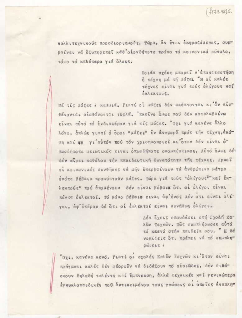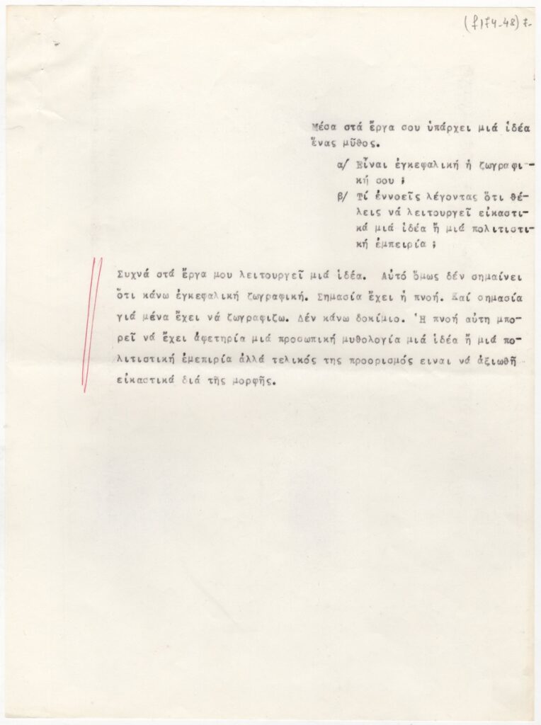 Συνέντευξη, δακτυλόγραφη, χαρτί, 7 φφ, 29×21,5 εκ., του Δημήτρη Γέρου στη Βεατρίκη Σπηλιάδη, με αφορμή παρουσίαση έργων του στο βιβλιοπωλείο “Στροφή”. Στη συνέντευξη ο καλλιτέχνης μιλά για την Τέχνη και το έργο του.