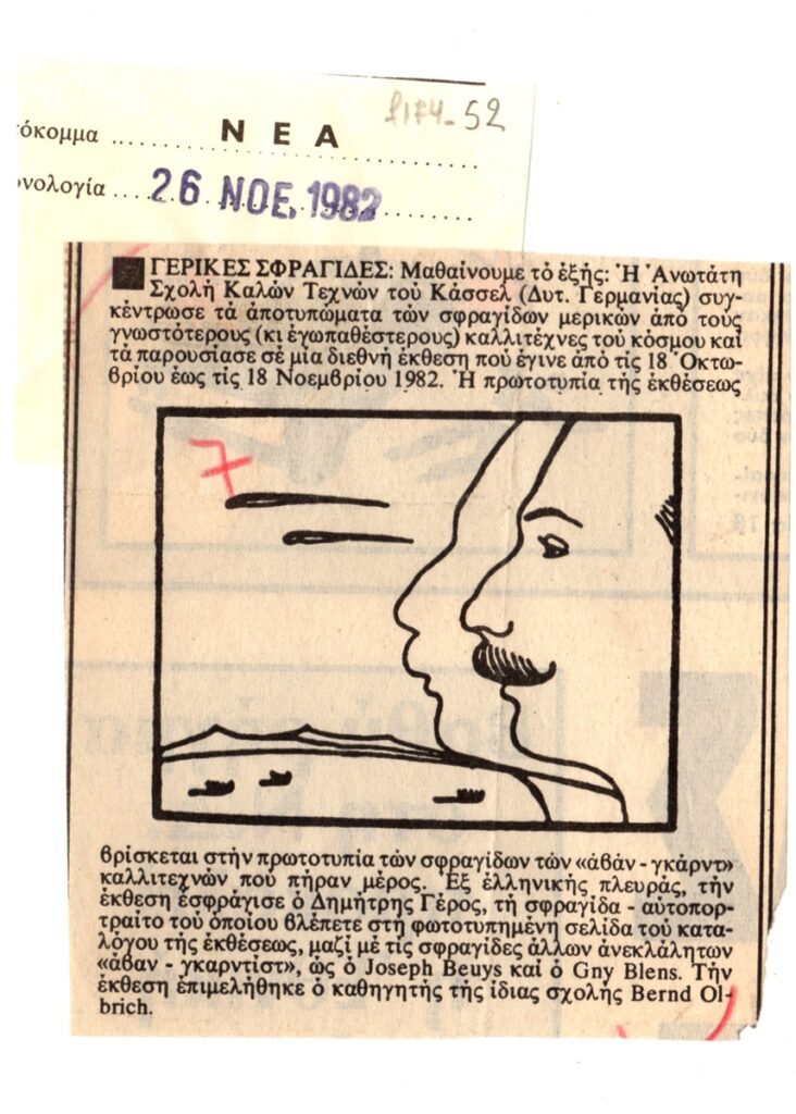 Απόκομμα, χαρτί, 13×10 εκ., στα ελληνικά, δημοσίευσης άρθρου αναφερόμενου σε διεθνή έκθεση που διεξήχθη στην Ανώτατη Σχολή Καλών Τεχνών του Κάσσελ, με αποτυπώματα σφραγίδων “αβαν-γκαρντ” καλλιτεχνών, ανάμεσα στους οποίους ο Δημήτρης Γέρος, ο οποίος εκπροσώπησε την ελληνική πλευρά.