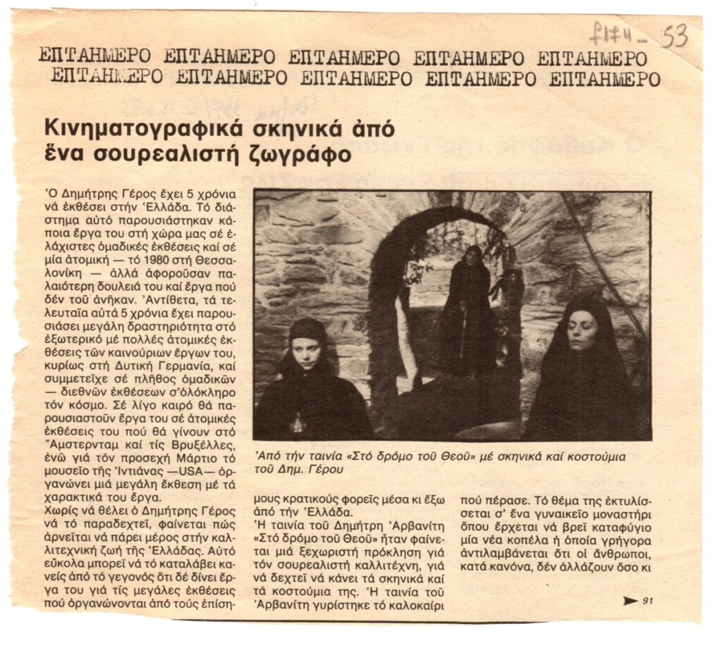 Απόκομμα, χαρτί διπλής όψης, 13×15 εκ., στα ελληνικά, δημοσίευσης άρθρου αναφερόμενου στον Δημήτρη Γέρο και τη δράση του στην Ελλάδα και το εξωτερικό.