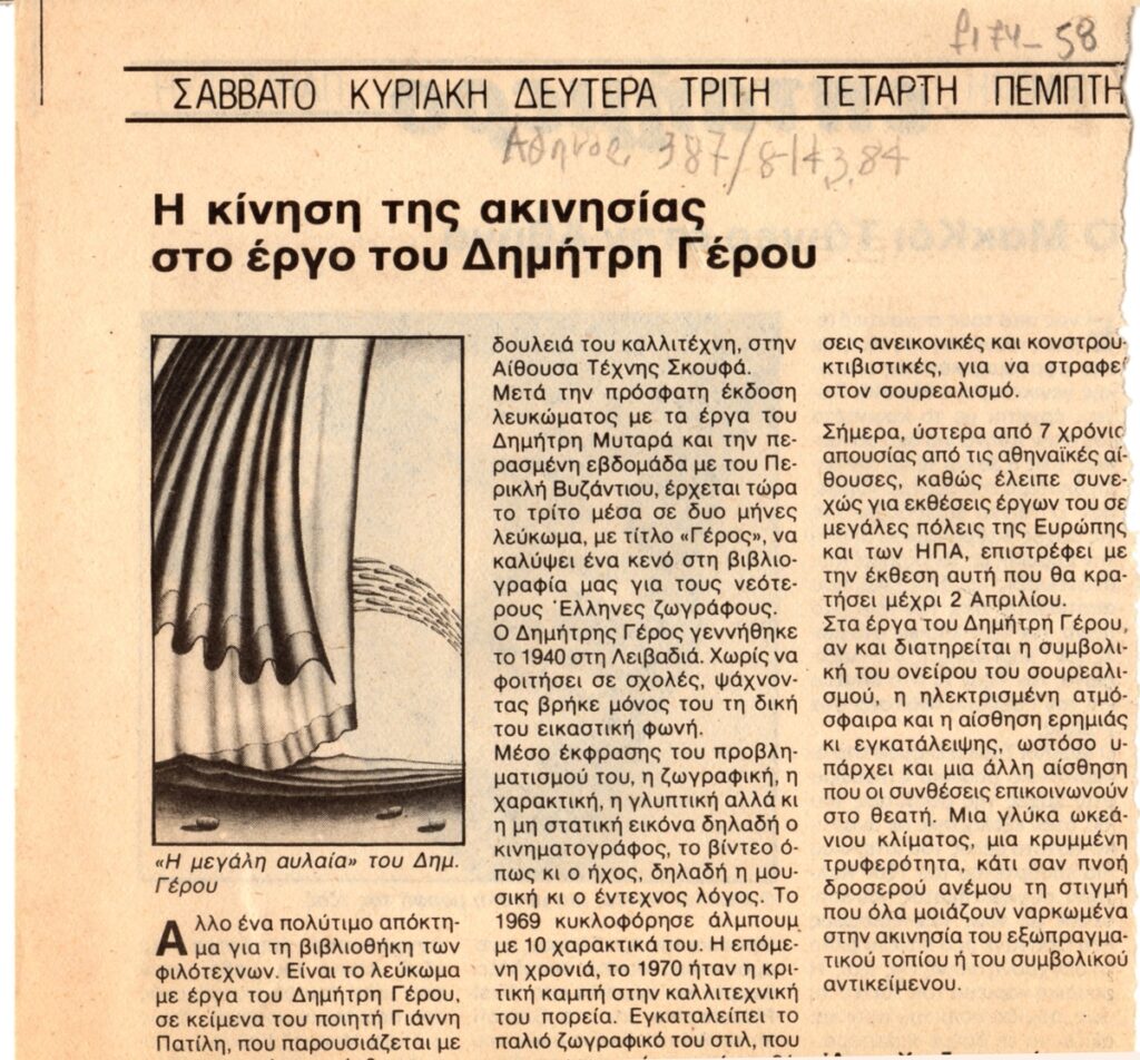 Απόκομμα, χαρτί, 15×15 εκ., στα ελληνικά, δημοσίευσης άρθρου αναφερόμενου σε λεύκωμα του Δημήτρη Γέρου. Περιέχει κριτικής έκθεσής του στην Αίθουσα Σκουφά στην Αθήνα.