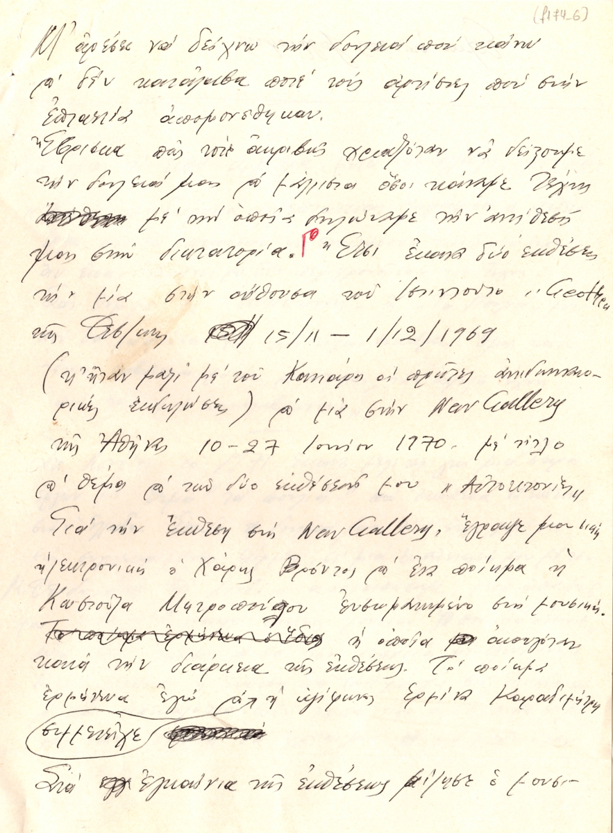 Ιδιόγραφο κείμενο, χαρτί, 3 φφ κολλημένα και 1 μονό, 29×21,5 εκ., στα ελληνικά, του Δημήτρη Γέρου, στο οποίο εκφράζεται για το έργο του και αναφέρεται σε ατομικές του εκθέσεις.