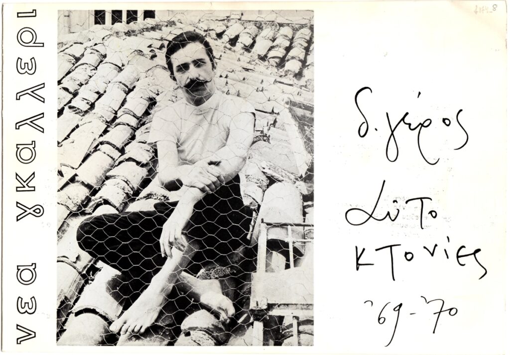 Έντυπο, χαρτόνι αναδιπλωμένο, 21×30 εκ., στα ελληνικά, ατομικής έκθεσης ζωγραφικής του Δημήτρη Γέρου στη Νέα Γκαλλερί στην Αθήνα. Το έντυπο περιέχει εικονογράφηση και κείμενο του καλλιτέχνη.