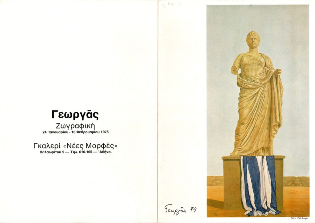 Έντυπο, χαρτόνι αναδιπλωμένο, 25×18 εκ., στα ελληνικά, έκθεσης του Μιχάλη Γεωργά, η οποία διεξάγεται στην Γκαλερί Νέες Μορφές στην Αθήνα. Περιέχει κείμενο για τον καλλιτέχνη και εικονογράφηση.