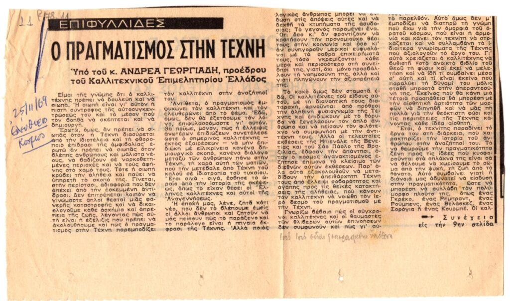 Απόκομμα, χαρτί, 2 φφ, 13×22,5 και 31×11,5 εκ., στα ελληνικά, δημοσίευσης κειμένου του Ανδρέα Γεωργιάδη για την Τέχνη.