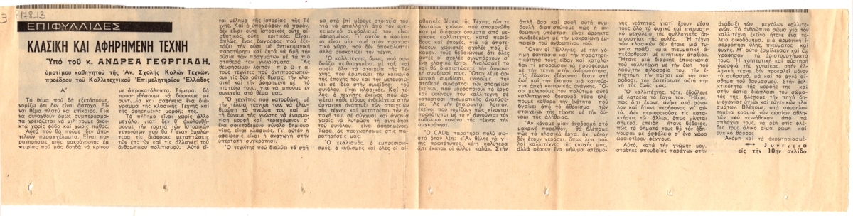 Απόκομμα, χαρτί, 10,5×43,5 εκ., στα ελληνικά, δημοσίευσης άρθρου του Ανδρέα Γεωργιάδη. Εντάσσεται στη στήλη “Επιφυλλίδες” του εντύπου.
