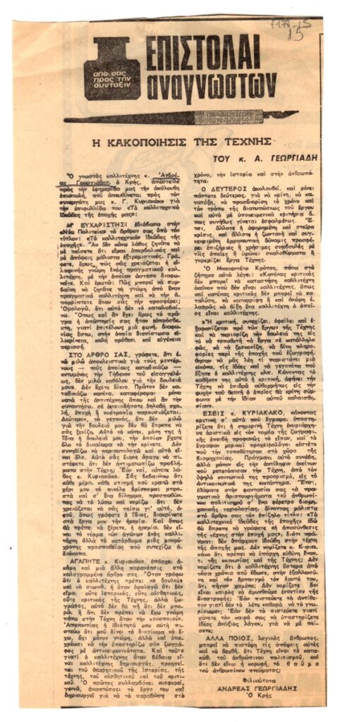 Απόκομμα, χαρτί, 25,7×11, 4 εκ., στα ελληνικά, δημοσίευσης επιστολής του Ανδρέα Γεωργιάδη στη στήλη του εντύπου “Επιστολαί αναγνωστών”.