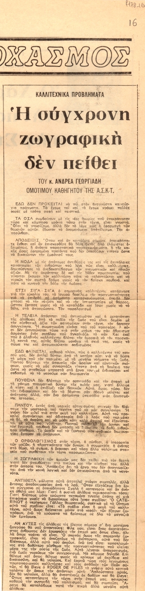 Απόκομμα, χαρτί, 44×11 εκ., στα ελληνικά, δημοσίευσης άρθρου του Ανδρέα Γεωργιάδη, για τη ζωγραφική. Εντάσσεται στη στήλη “Καλλιτεχνικά προβλήματα” του εντύπου.