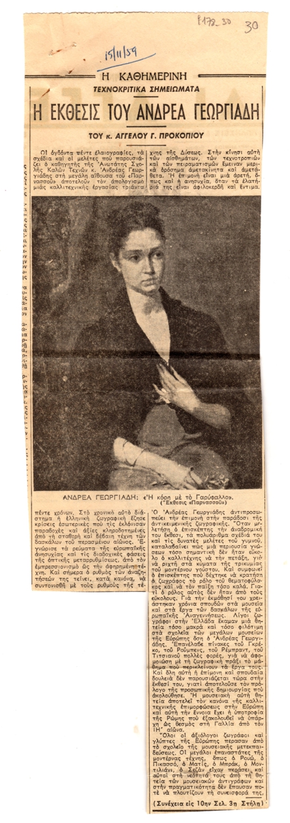 Απόκομμα, χαρτί, 2 φφ, 34,5×10 και 34,5×5,5 εκ., δημοσίευσης κριτικής έκθεσης του Ανδρέα Γεωργιάδη, η οποία διεξάγεται στον Φιλολογικό Σύλλογο Παρνασσό στην Αθήνα.