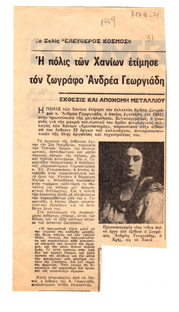 Απόκομμα, χαρτί, 21×11 εκ., στα ελληνικά, δημοσίευσης άρθρου αναφερόμενου στην απονομή μεταλλίου στον Ανδρέα Γεωργιάδη και στην ατομική του έκθεση στο φιλολογικό σύλλογο Χανίων “Χρυσόστομο”.