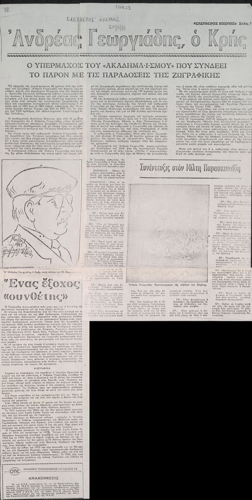 Φωτοαντίγραφο, χαρτί, ακανόνιστου σχήματος, στα ελληνικά, δημοσίευσης τμήματος συνέντευξης του Ανδρέα Γεωργιάδη και κειμένου για το εργο του, στο πλαίσιο αναδρομικής του έκθεσης.