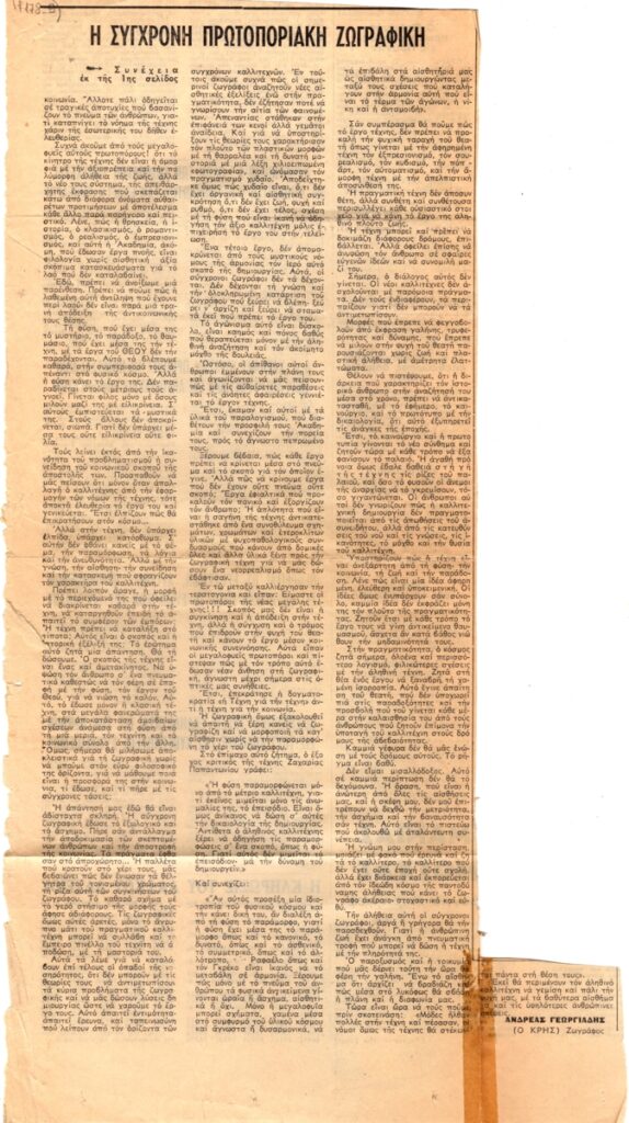 Απόκομμα, χαρτί, 2 φφ, 9×25,5 και 39×21,5 εκ., στα ελληνικά, δημοσίευσης άρθρου του Ανδρέα Γεωργιάδη, στο οποίο γράφει για τη σύγχρονη πρωτοποριακή ζωγραφική.