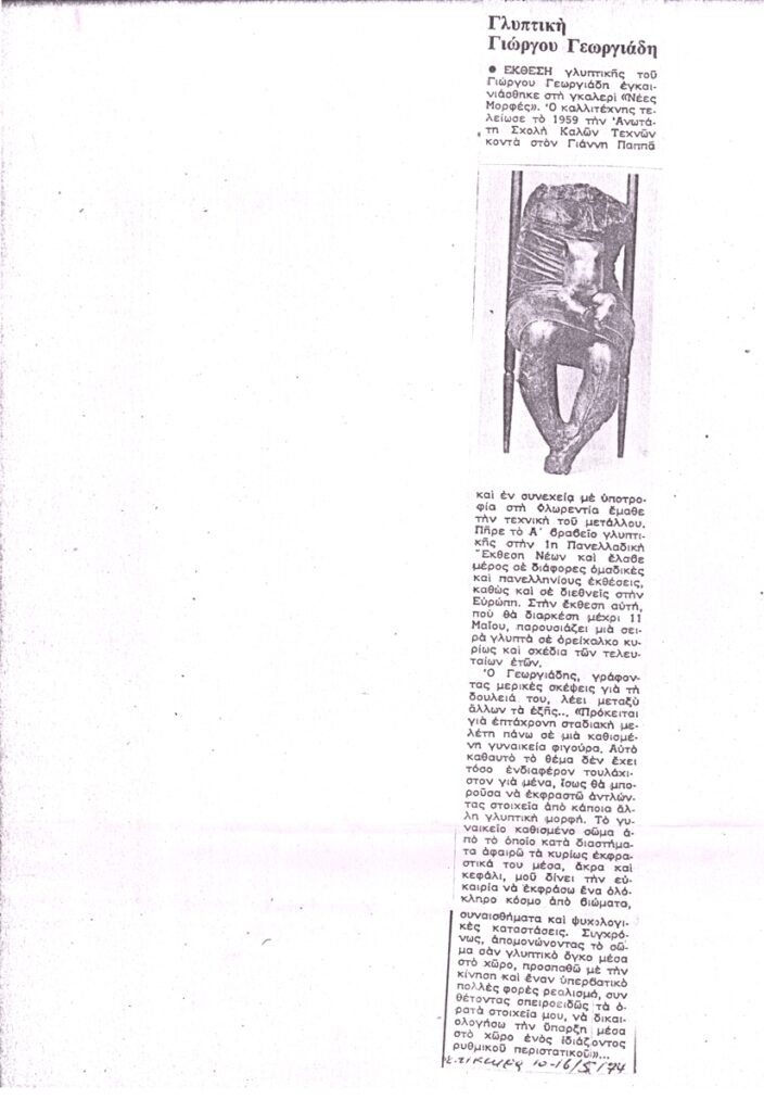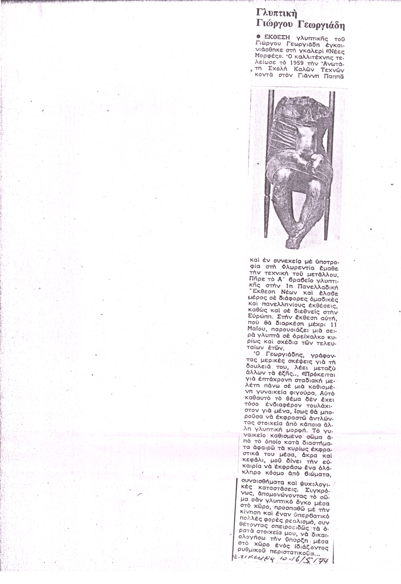 Φωτοαντίγραφο, χαρτί, 24,6×21 εκ., στα ελληνικά, δημοσίευσης κριτικής έκθεσης του Γιώργου Γεωργιάδη, η οποία διεξάγεται στην γκαλερί Νέες Μορφές.