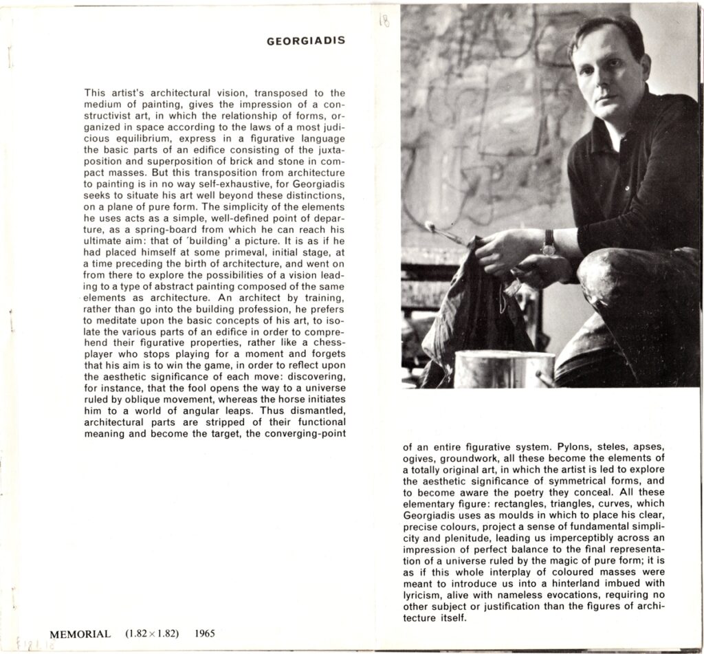 Απόκομμα εντύπου έκθεσης, χαρτί ιλλουστρασιόν, 3 φφ, στα αγγλικά και γαλλικά, 22×24 εκ. Το απόκομμα περιέχει κείμενο για τον Νικόλαο Γεωργιάδη και το έργο του και εικονογράφηση.