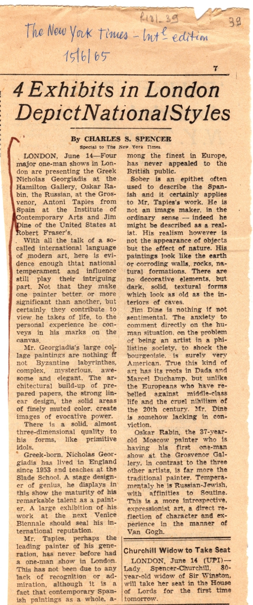 Στο ίδιο κείμενο, αναφέρονται οι εκθέσεις των Oskar Rabin, Antoni Tapies, Jim Dine, Robert Fraser.