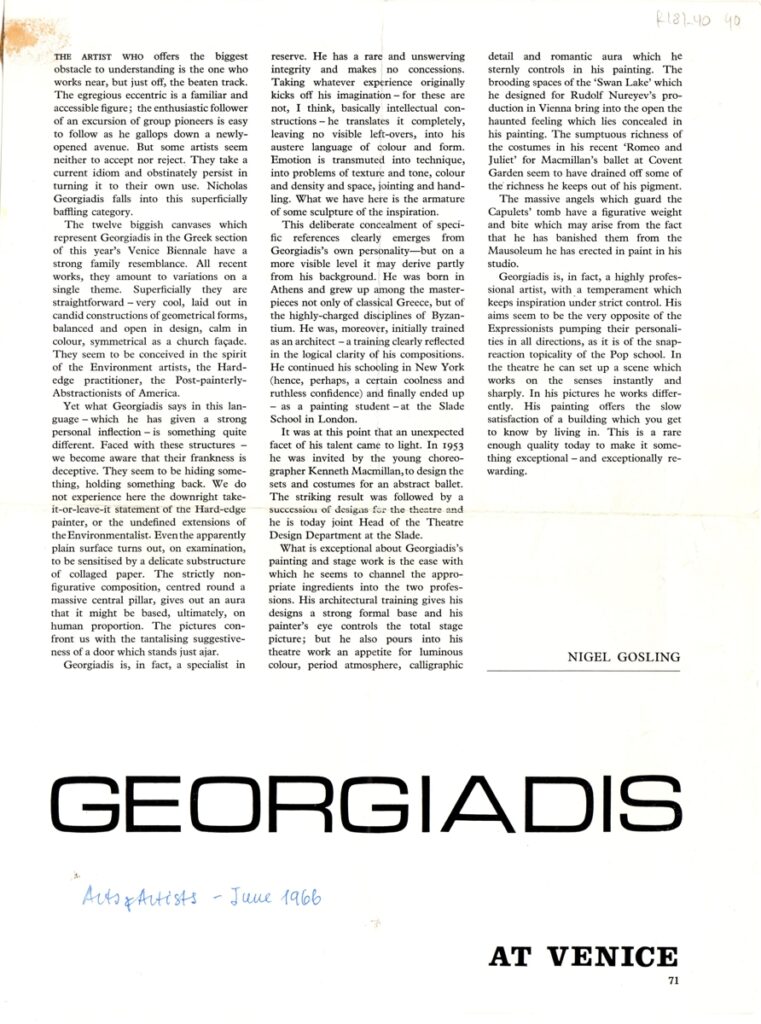 Απόκομμα, χαρτί ιλλουστρασιόν διπλής όψεως, 2 φφ, 27,5×20,5 εκ., στα αγγλικά, δημοσίευσης άρθρου για το έργο του Νικόλαου Γεωργιάδη, που παρουσιάζει ως Έλληνας αντιπρόσωπος στην Μπιεννάλε Βενετίας 1966.