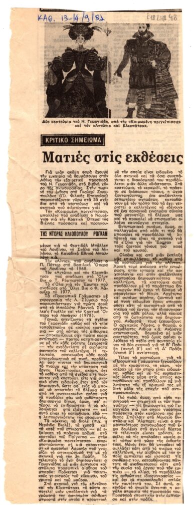 Απόκομμα, χαρτί, 34×12,5 εκ., στα ελληνικά, δημοσίευσης κριτικής για την ατομική έκθεση του Νίκου Γεωργιάδη στην γκαλερί Ζουμπουλάκη το 1981.