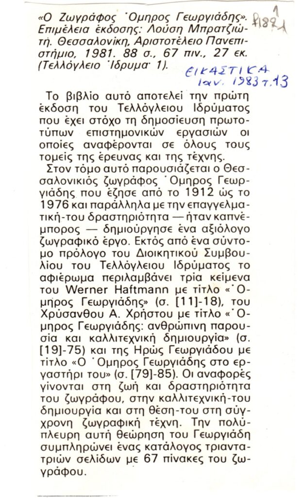 Απόκομμα, χαρτί, 14,5×8 εκ., στα ελληνικά, δημοσίευσης βιβλιοκριτικής για την α’ έκδοση του Τελλογλείου Ιδρύματος Τεχνών, αφιερωμένη στο Θεσσαλονικιό ζωγράφο Όμηρο Γεωργιάδη.