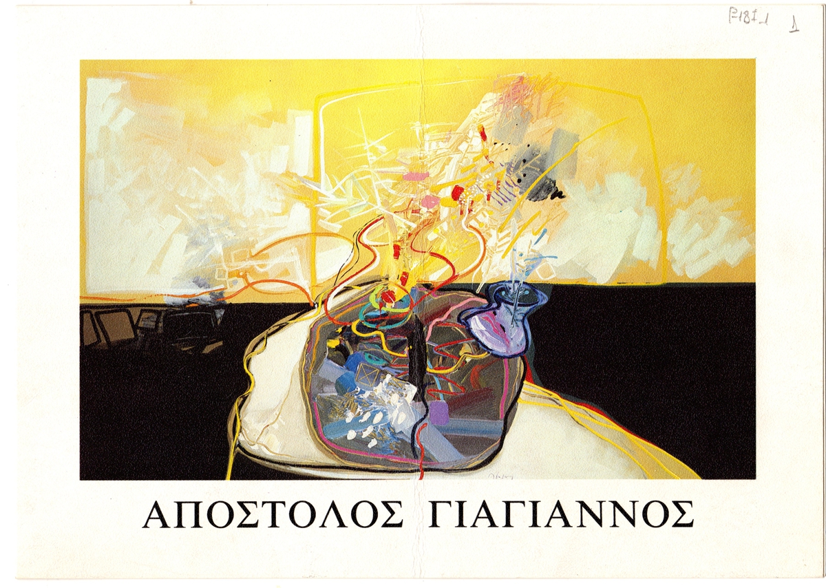 Έντυπο, χαρτόνι αναδιπλωμένο, 17×24 εκ., στα ελληνικά, ατομικής έκθεσης ζωγραφικής του Απόστολου Γιαγιάννου. Περιέχει κείμενο του Μάνου Στεφανίδη με τίτλο “Οι ‘Νεκρές Φύσεις’ του Απόστολου Γιαγιάννου” και βιογραφικό σημείωμα.