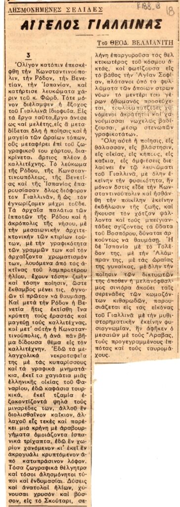 Απόκομμα, χαρτί, 29×10 εκ., στα ελληνικά, δημοσίευσης άρθρου για τη ζωή και το έργο του Άγγελου Γιαλλινά. Εντάσσεται στη στήλη του εντύπου “Λησμονημένες Σελίδες”.