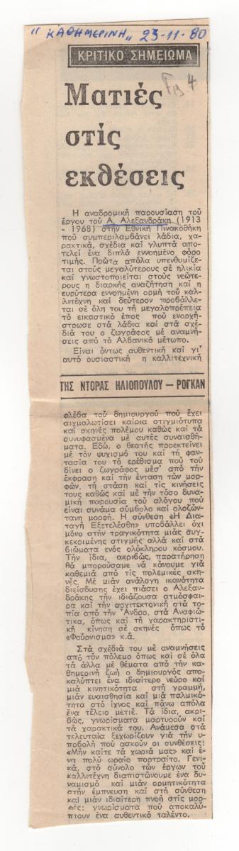 Απόκομμα, έντυπο, χαρτί, 26,6×6,0 εκ., στα ελληνικά. Κριτική της Ντόρας Ηλιοπούλου Ρογκάν για την αναδρομική έκθεση του Αλέξανδρου Αλεξανδράκη στην Εθνική Πινακοθήκη το 1980. Εντάσσεται στη στήλη “Ματιές στις εκθέσεις”. Επάνω, επιγραφή με τα στοιχεία δημοσίευσης.