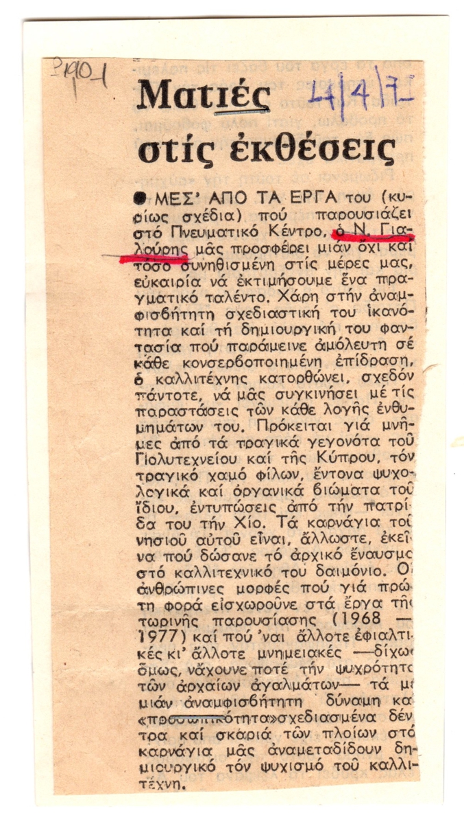 Απόκομμα, χαρτί, συρραμμένο σε απόκομμα εντύπου, 13×7 εκ., στα ελληνικά, δημοσίευσης κριτικής ατομικής έκθεσης του Νίκου Γιαλούρη, η οποία διεξάγεται στο Πνευματικό Κέντρο Αθηνών. Εντάσσεται στην ομώνυμη στήλη του εντύπου.