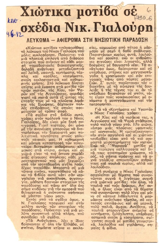 Απόκομμα, χαρτί, 17,5×11 εκ., στα ελληνικά, δημοσίευσης άρθρου αναφερόμενου στο λεύκωμα με τίτλο “Χιώτικα μοτίβα” που κυκλοφόρησε ο Νίκος Γιαλούρης.